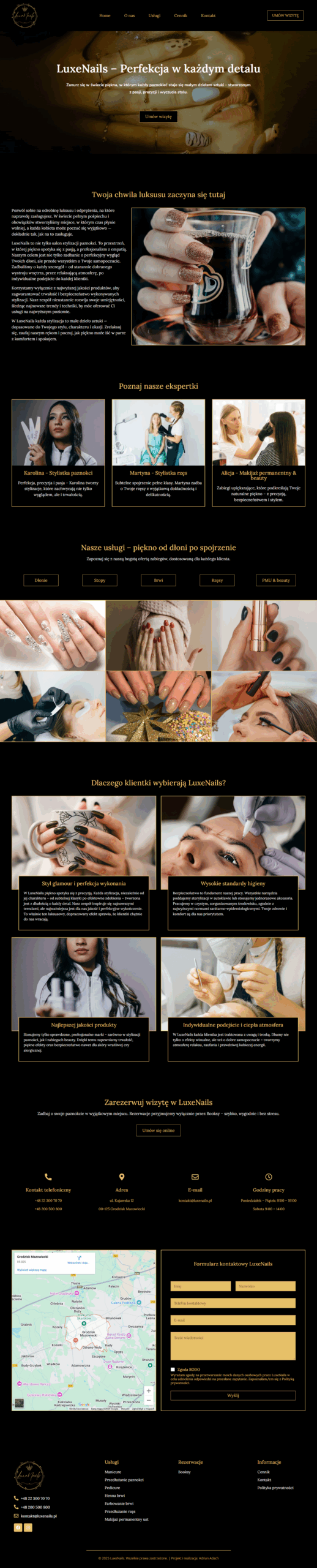 Nowoczesna strona salonu stylizacji paznokci z systemem rezerwacji online i eleganckim designem glamour.