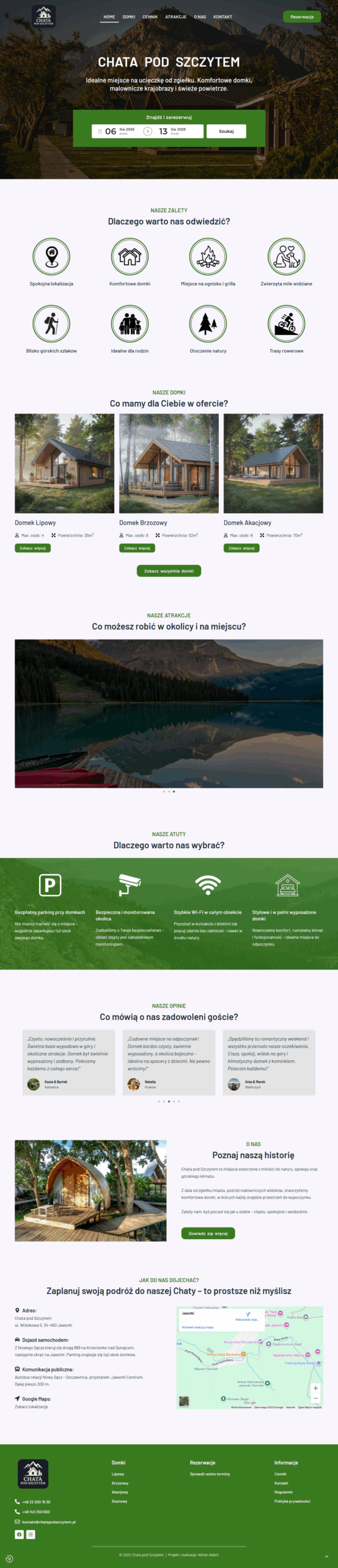 Strona rezerwacyjna dla domków w górach z nowoczesnym systemem rezerwacji zintegrowanym z Booking.com i Airbnb. Prosty układ, atrakcyjny design i nawigacja pozwalają gościom w kilka kliknięć zarezerwować pobyt.